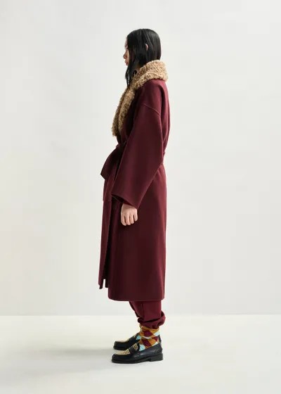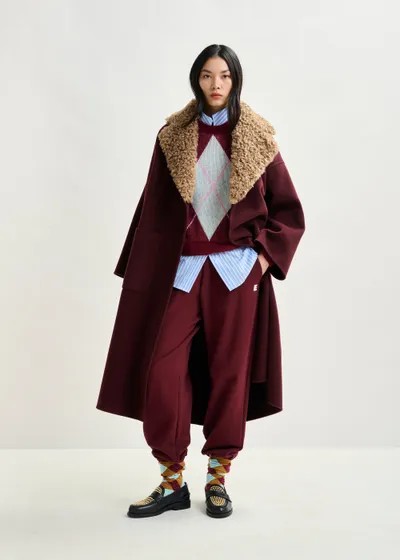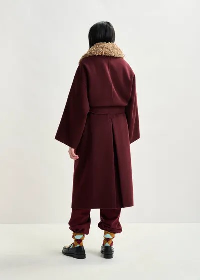 Tissé d'une laine pure, ce manteau a été soigneusement feutré pour lui donner davantage de douceur et de lustre. Sa légère coupe trapèze est pourvue de poches plaquées pratiques, d'élégants revers crantés, d'une emmanchure basse et d'une ceinture pour la porter fermée. Le col amovible en fausse fourrure ajoute une touche de polyvalence et de raffinement. Cette pièce intemporelle donnera du lustre à chaque tenue, saison après saison.