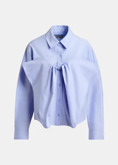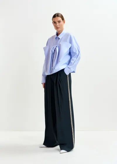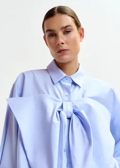 Chemise en coton mélangé, qui réinvente une coupe classique avec une touche d'audace. Elle est dotée d'un col habillé et d'une fermeture à boutons sur le devant. La chemise se distingue de par son nœud décoratif sur la poitrine, qui lui donne une allure élégante.