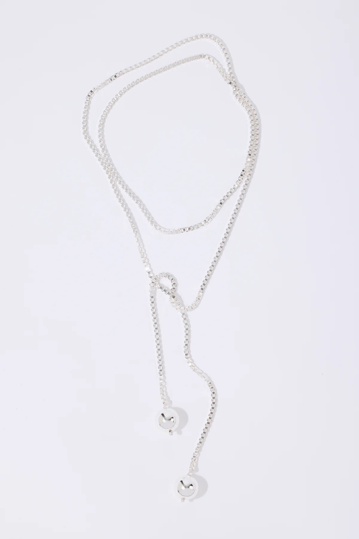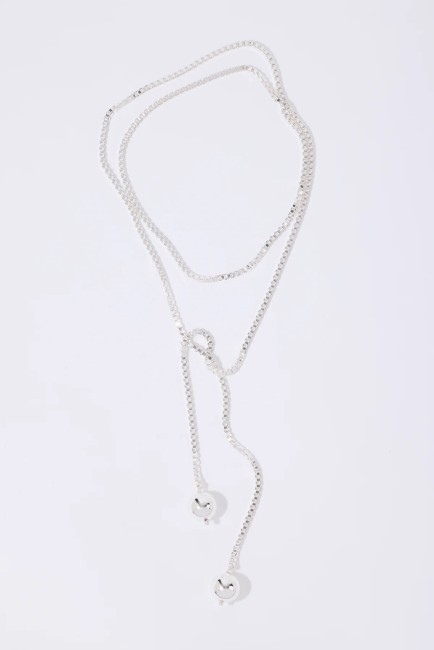Ce collier à nouer est composé d'une élégante chaîne à maillons carrés ornée de détails