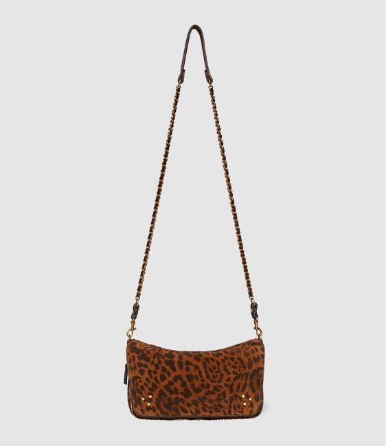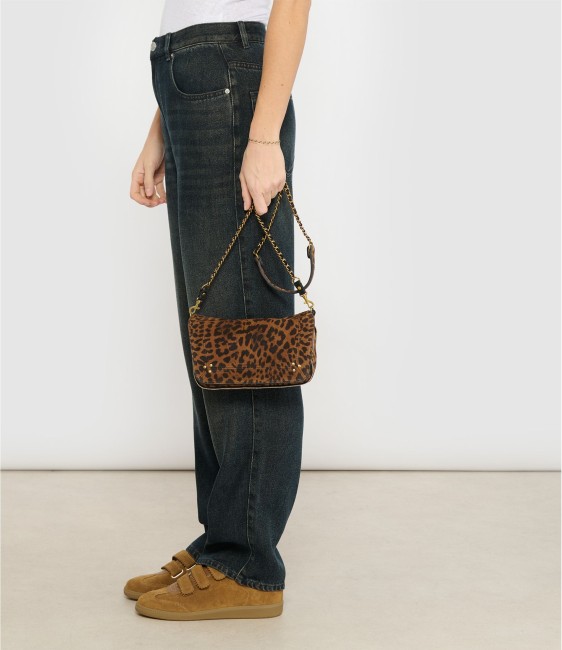 Bandoulière tressée en cuir et chaîne, amovible par mousquetons, et réglable en deux longueurs.