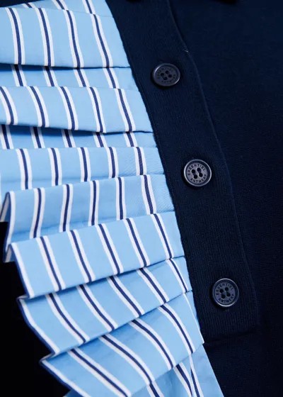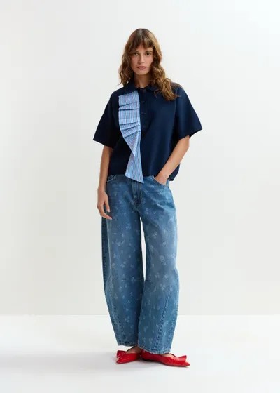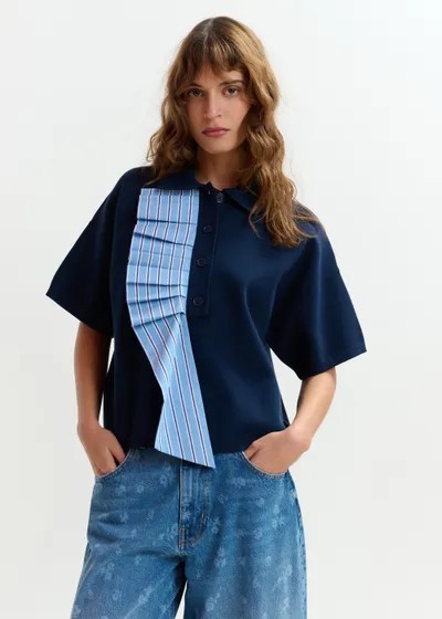 Polo confectionné à partir d'une maille fine dans une silhouette décontractée. Le modèle classique à manches courtes est réinventé avec une cascade asymétrique de volants en popeline à rayures le long de la patte de boutonnage, ajoutant dimension et mouvement. Un col pointu et une fermeture à boutons ton sur ton complètent le look, tout en équilibrant structure et détails ludiques.
