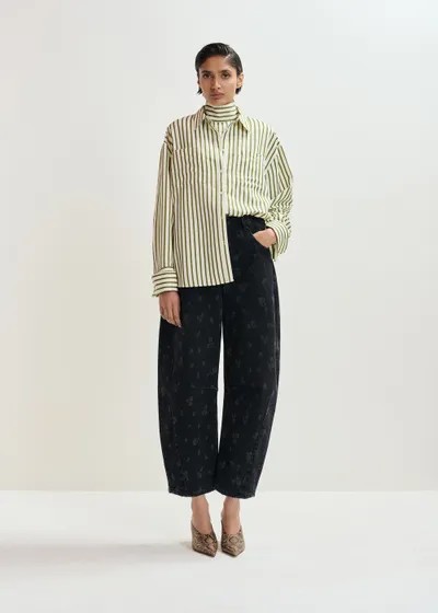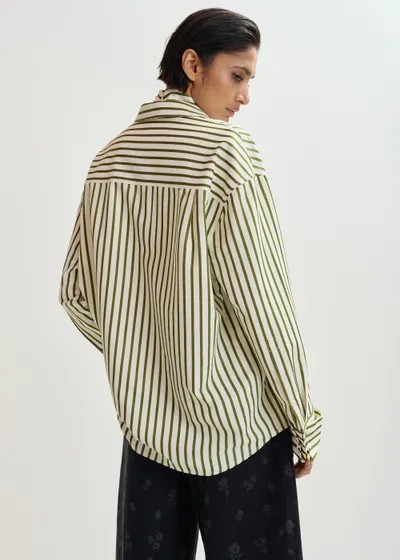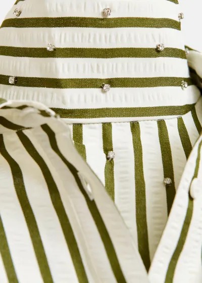Pensée dans une coupe intentionnellement oversize, cette chemise à rayures associe des éléments de chemise classiques à des détails de texture inattendus. Elle est dotée d'une fermeture à boutons, de deux poches poitrine et d'un pan arrondi plus long dans le dos pour offrir un drapé fluide. Les subtils ornements en strass ajoutent une touche d'éclat. Un plastron assorti est glissé sous la chemise, avec fermeture à glissière dissimulée pour une superposition lisse.