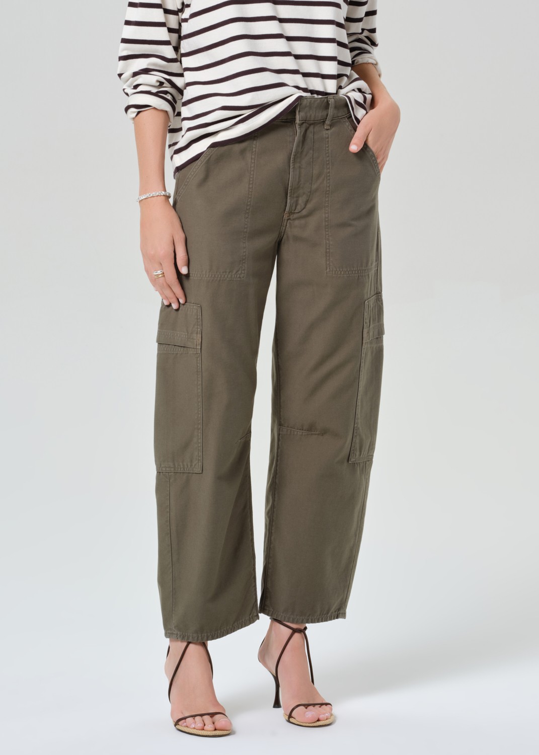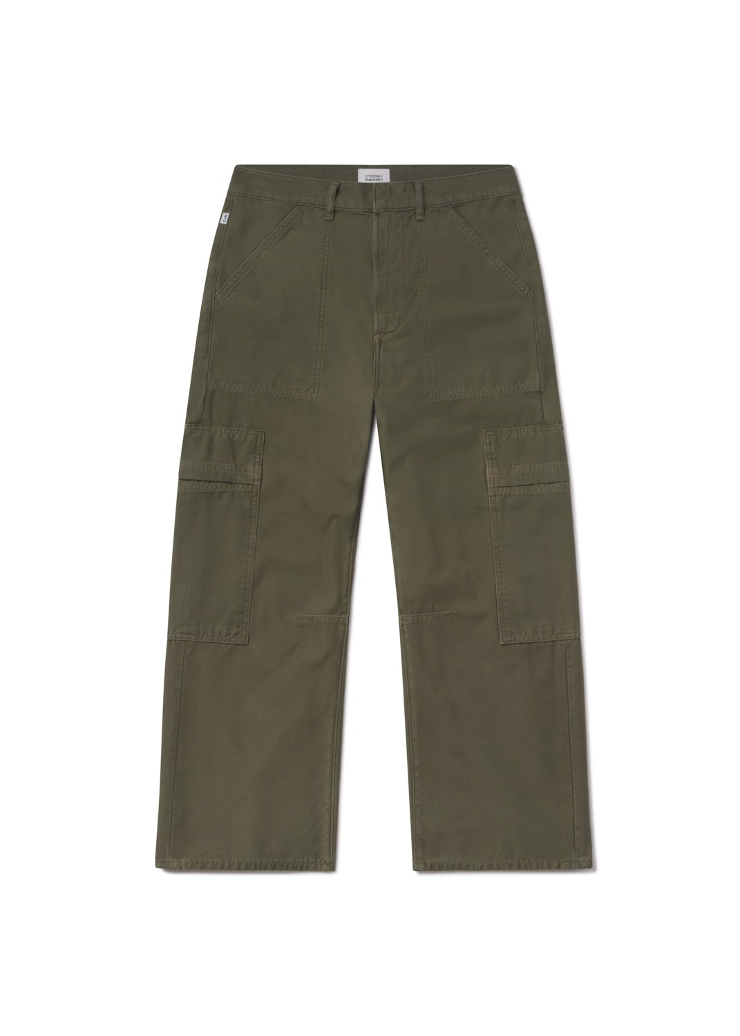 Pantalon en coton kaki avec des détails inspirés du cargo. Fermeture par bouton et zip.