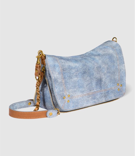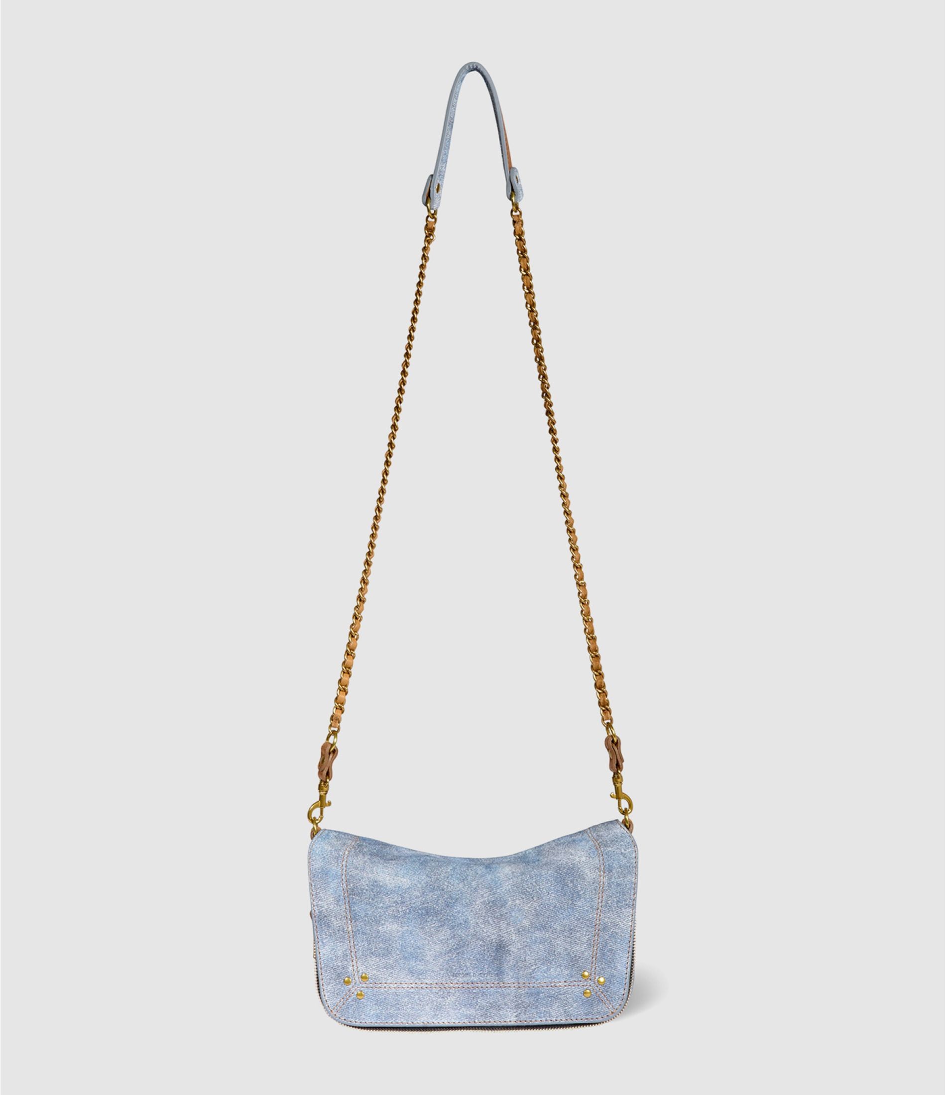 Bandoulière tressée en cuir et chaîne, amovible par mousquetons, et réglable en deux longueurs.