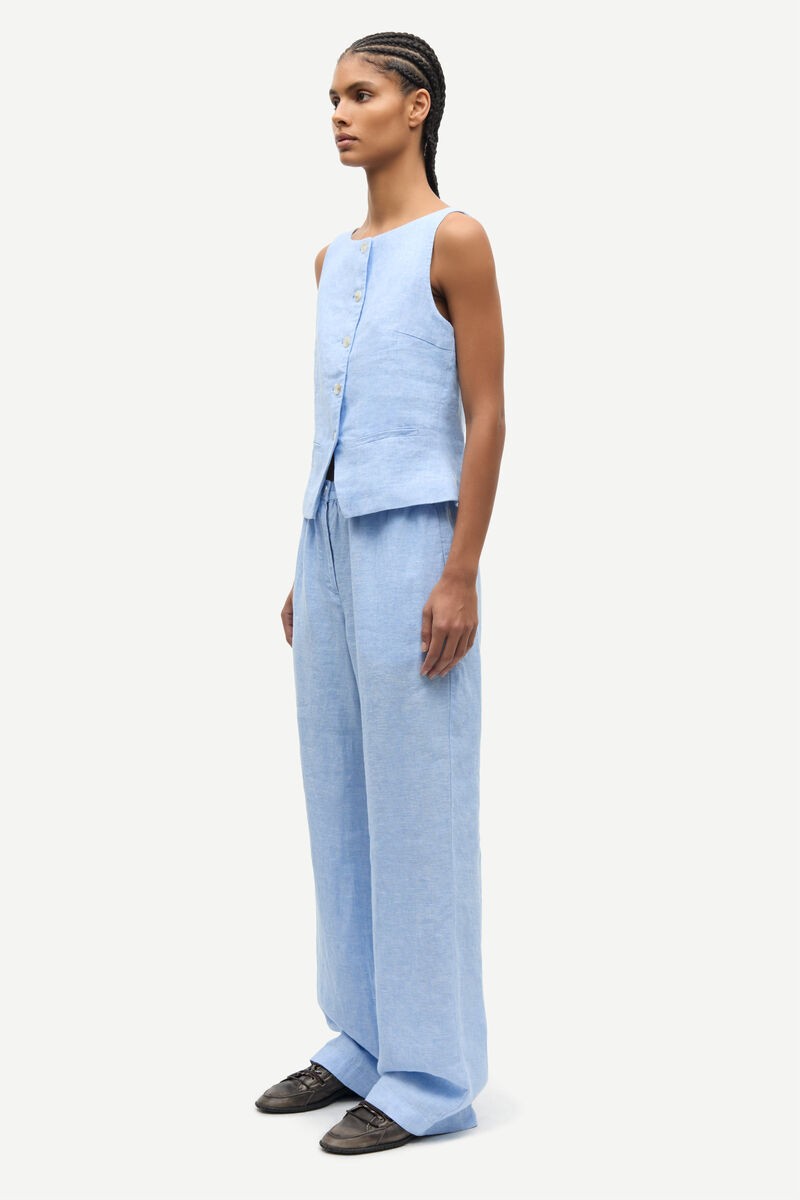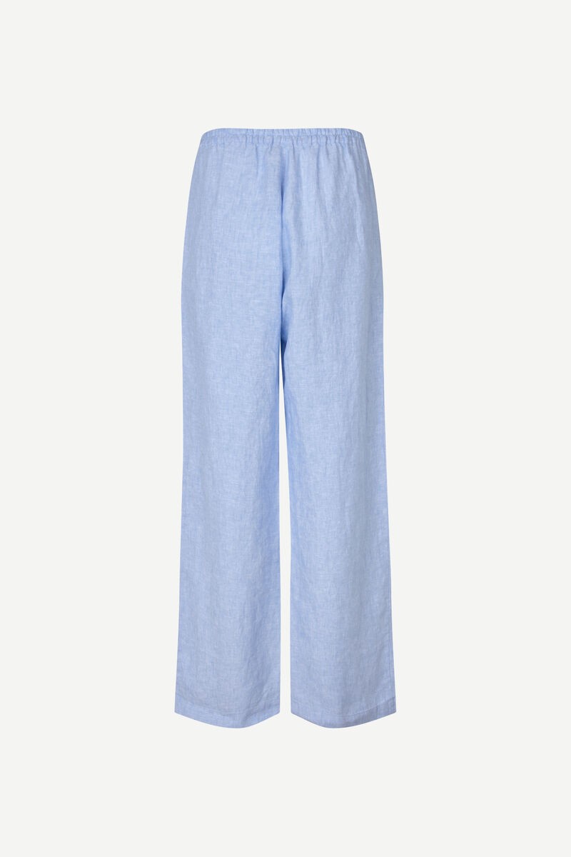 Pantalon en lin à coupe regular et jambe large. Fermeture boutonnée et zippée sur le devant, taille élastiquée.