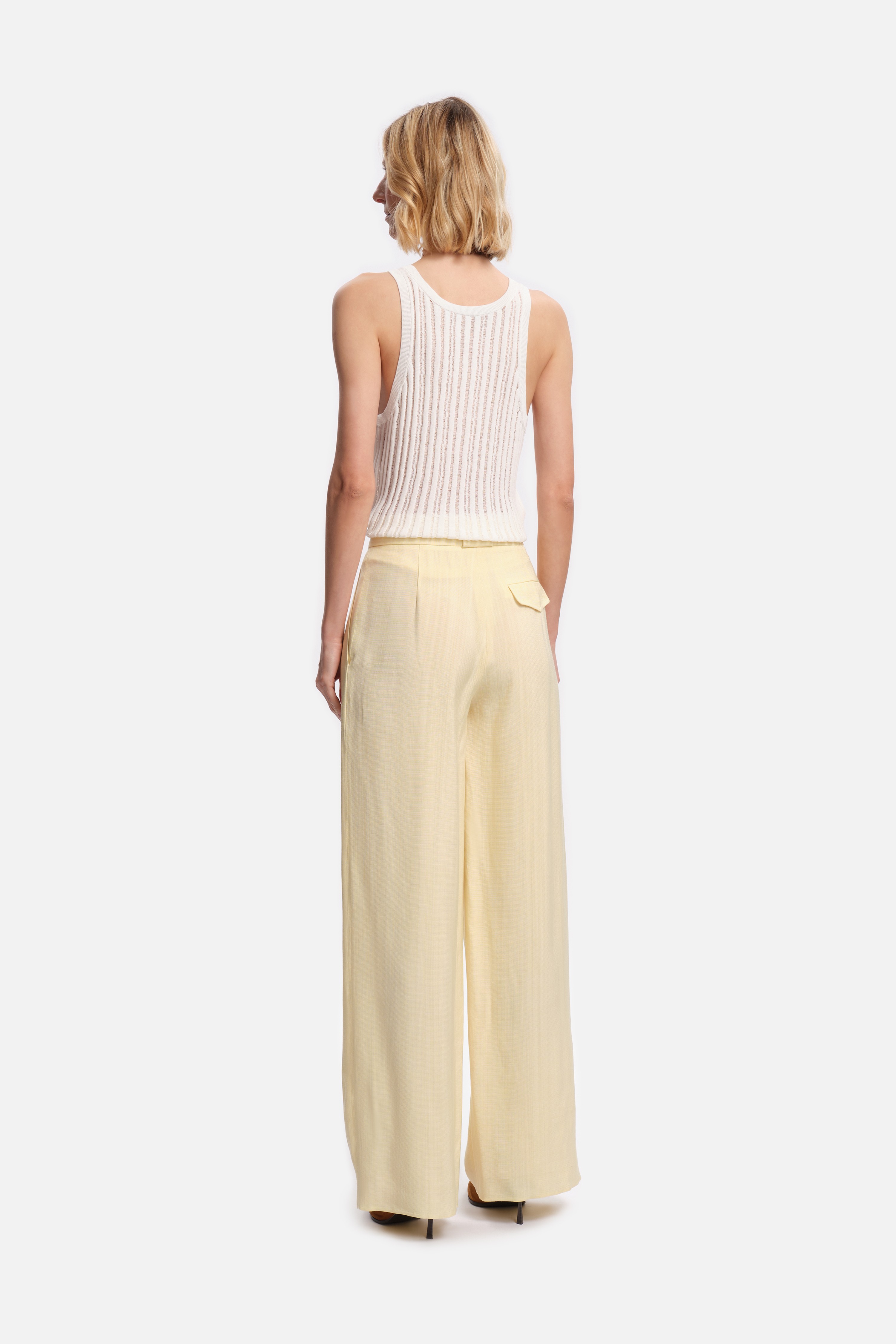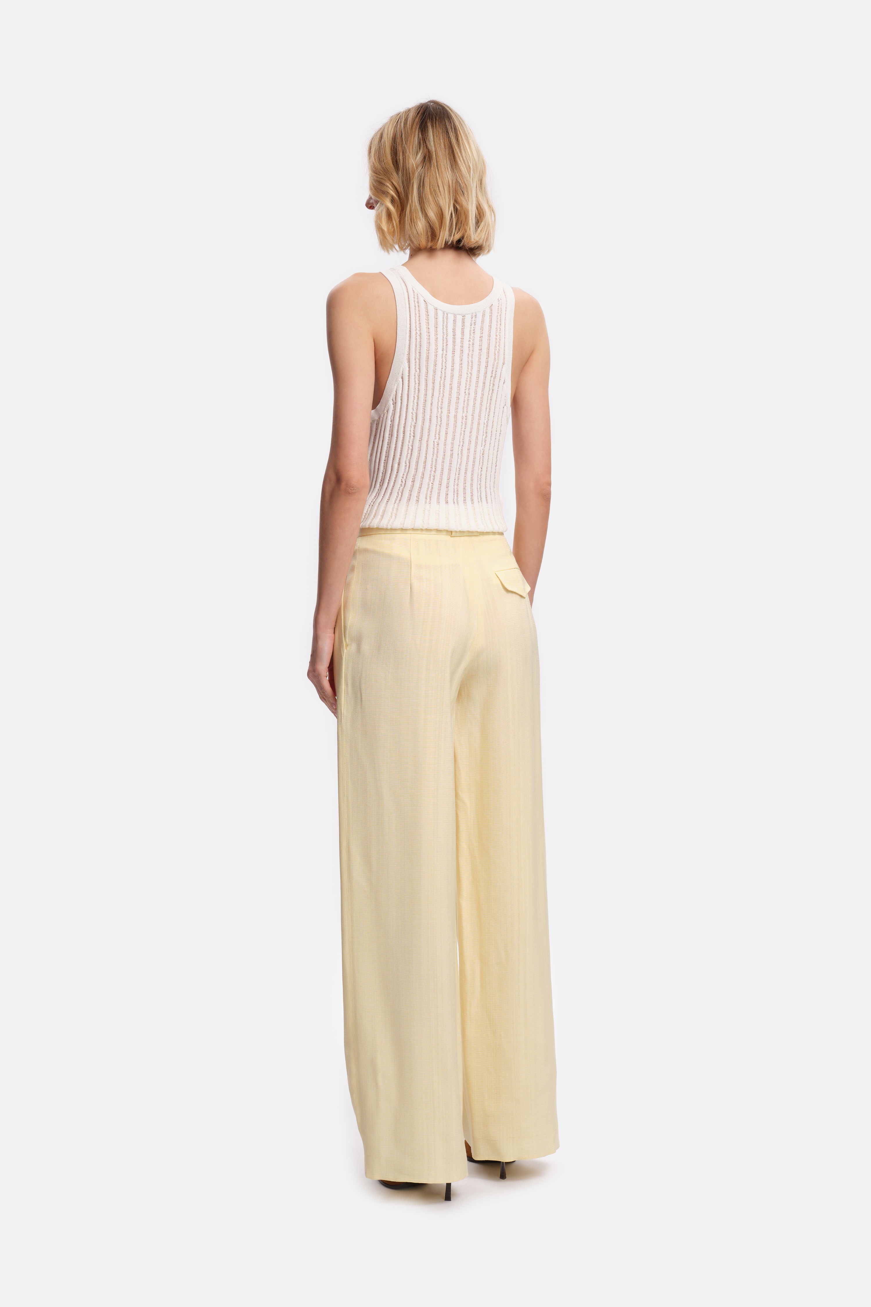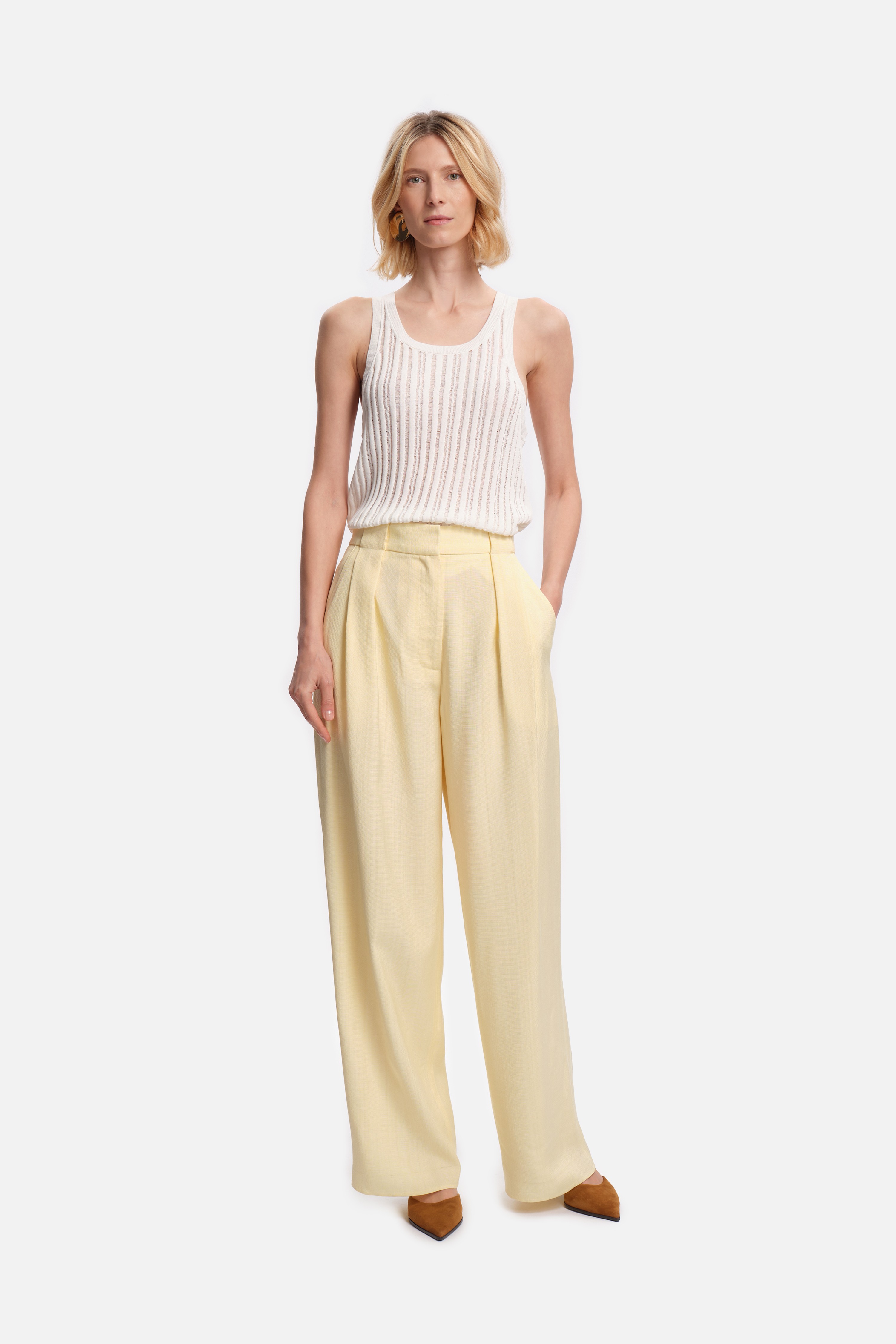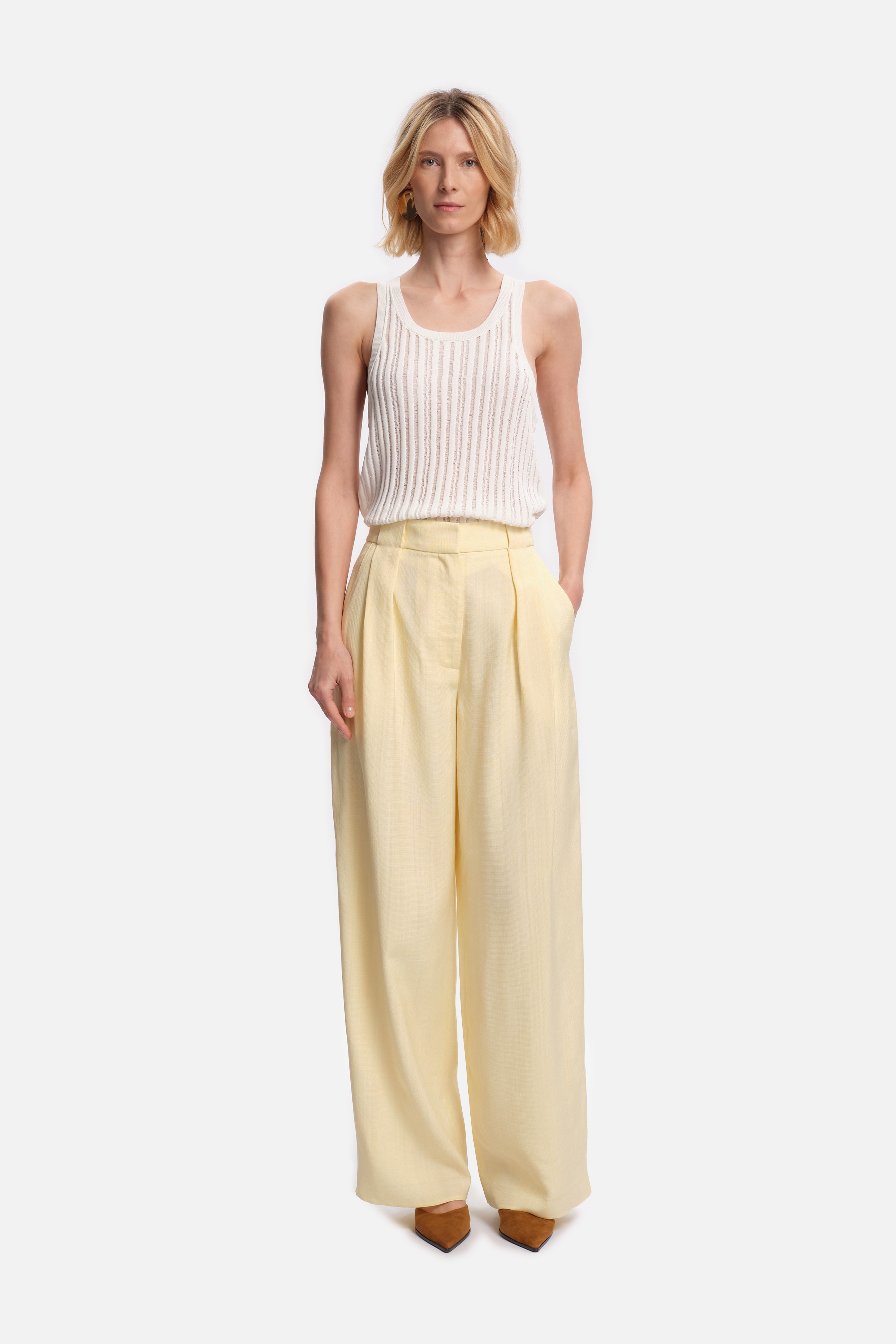 Les plis marqués sur le devant et les jambes larges soulignent sa silhouette structurée, tandis que la matière fluide et légèrement texturée apporte confort et élégance.