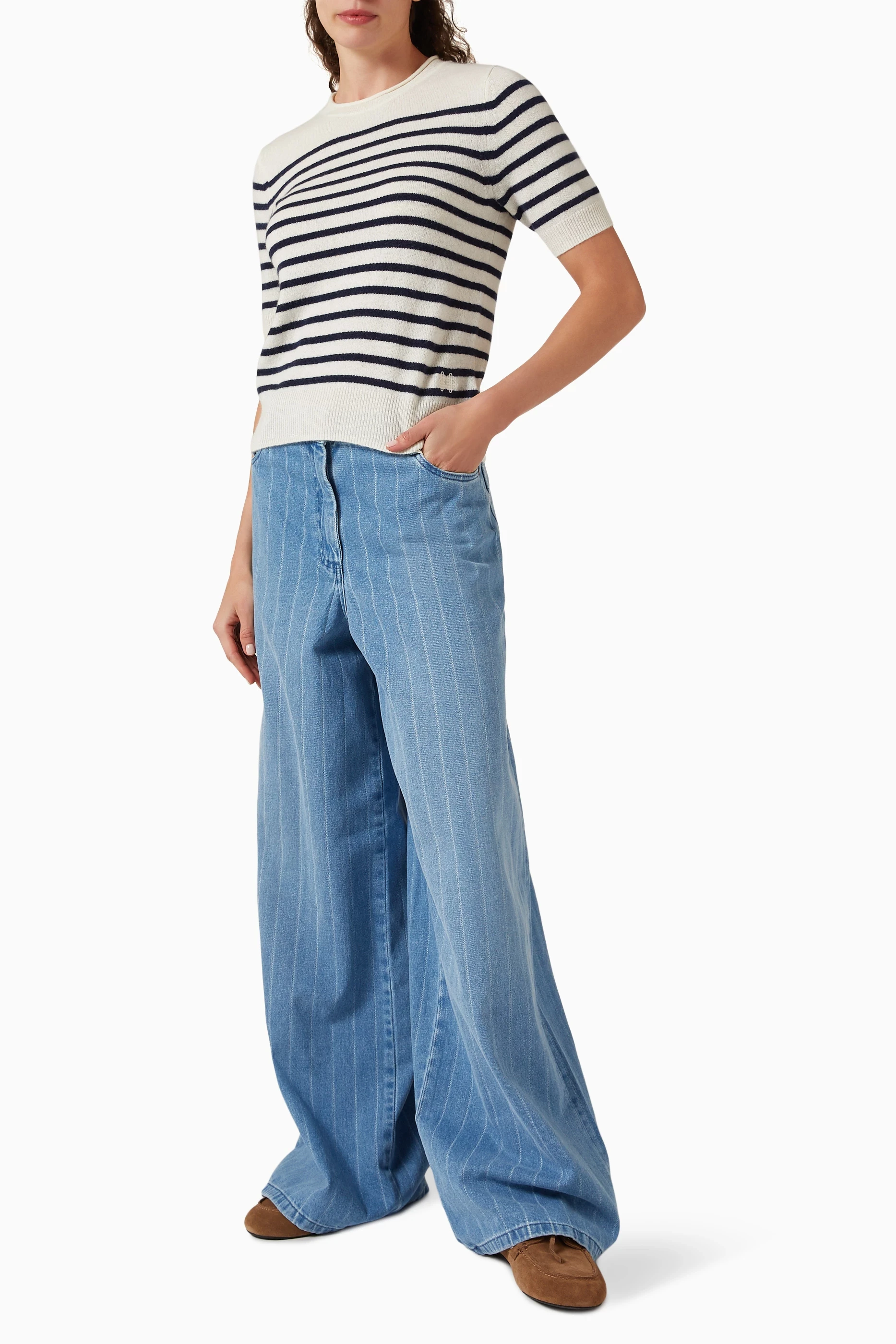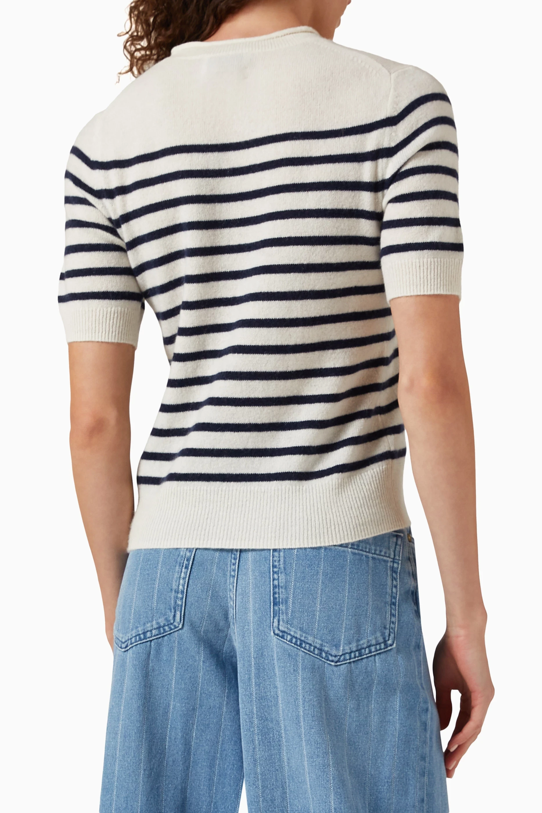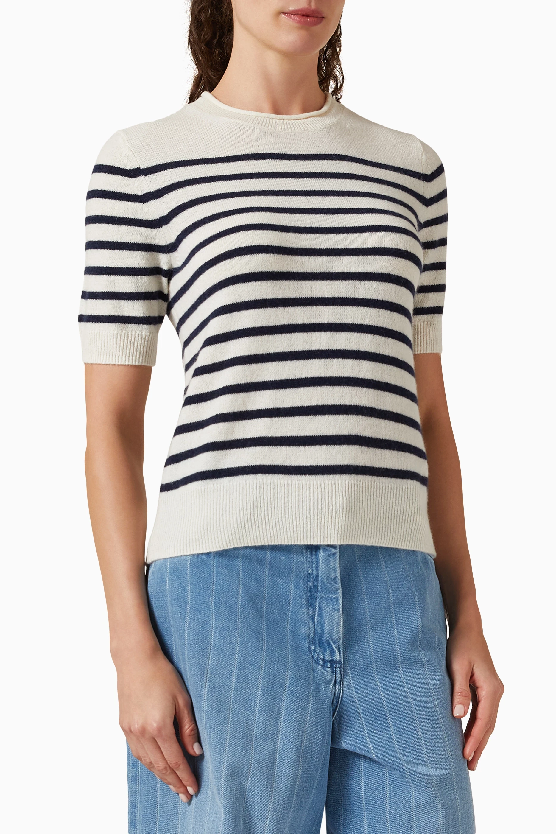 - Pull col rond manches courtes mariniere blanc