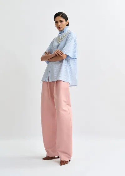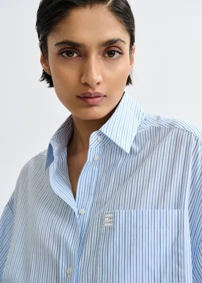 Chemise oversize réalisée en 100 % coton dans une coupe décontractée. Elle présente un col classique, une fermeture par boutonnage et une emmanchure basse. Elle se fait remarquer avec ses manches 3/4, sa poche poitrine avec E brodé et ses fentes latérales pour une liberté de mouvement accrue. Un foulard triangulaire séparé avec ornement le long du bord inférieur vient ajouter une touche joyeuse.