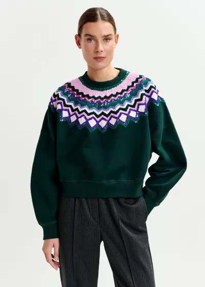 SWEATSHIRT EN COTON VERT FONCE A PAILLETTES MULTICOLORES - ESSENTIEL ANTWERP